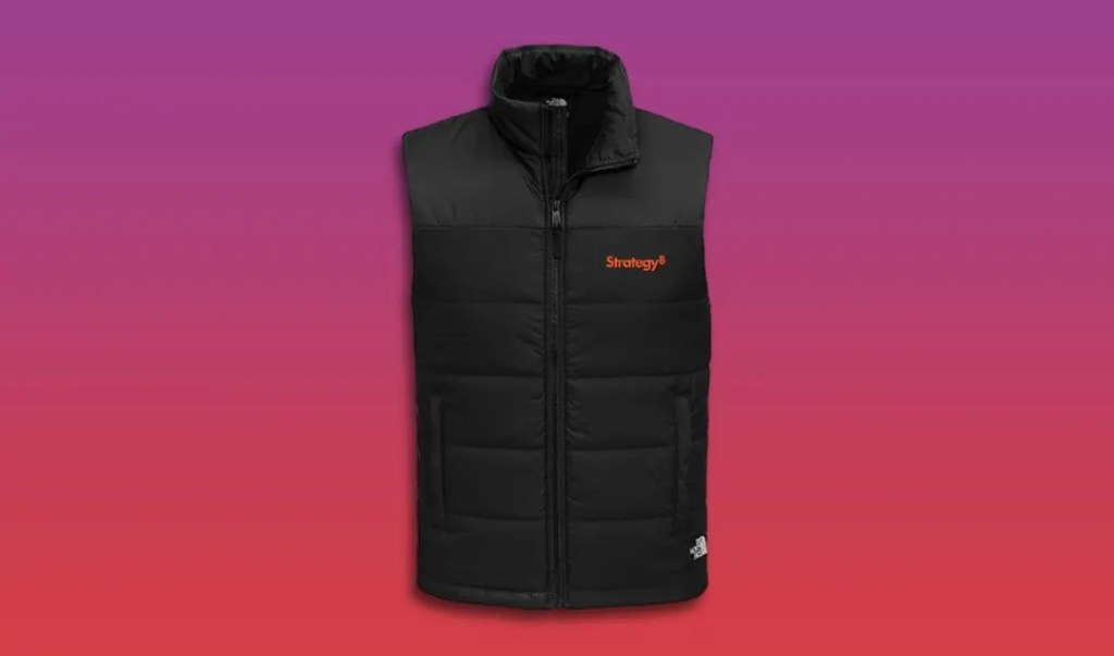 A empresa de tesouraria em Bitcoin Strategy oferece uma ampla variedade de roupas e acessórios com sua marca, desde copos de cerveja até uma gravata de preço francamente exorbitante. Mas, para os aspirantes a finance bros, nada substitui um colete.