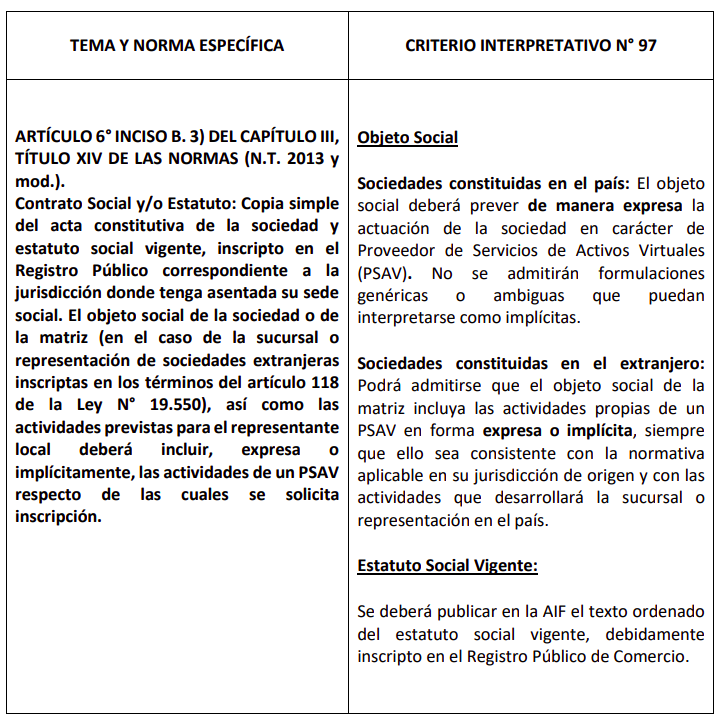 Dessa forma, a CNV estabelece que as sociedades argentinas devem refletir em seu estatuto social a prestação de serviços como PSAV. O órgão esclarece que não serão aceitas formulações vagas ou ambíguas, visando oferecer maior clareza e segurança jurídica para empresas, reguladores e usuários.