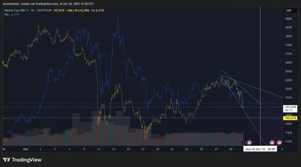 No geral, ambas as moedas estão em tendência de baixa no momento. O gráfico comparativo de capitalização de mercado mostra o XRP (azul) testando uma linha de tendência descendente por cima, e embora ainda esteja acima do suporte principal, a trajetória é claramente negativa. O volume tem diminuído durante a queda — muitas vezes um precursor para uma recuperação ou capitulação.