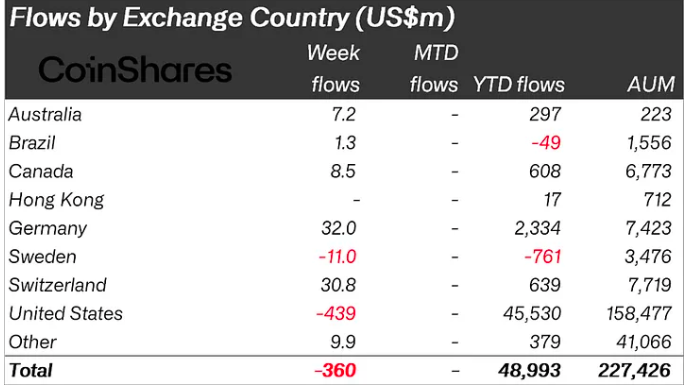 Regionalmente, o sentimento negativo concentrou-se principalmente nos Estados Unidos, que registraram saídas totais de US$ 439 milhões. Isso foi parcialmente compensado por pequenas entradas de Brasil, Alemanha e da Suíça, que totalizaram US$ 1,3 milhão, US$ 32 milhões e US$ 30,8 milhões, respectivamente.