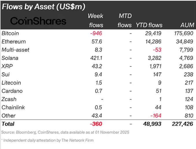 No recorte por tipo de ativo, os ETFs de Bitcoin foram os únicos grandes produtos de ativos digitais a registrar saídas significativas na semana passada, somando US$ 946 milhões.