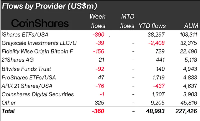 Na análise por produtos, o maior ETF de Bitcoin do mercado, o iShares da BlackRock, liderou as perdas com US$ 390 milhões. Na sequência veio o Grayscale Investments, com saídas de US$ 39 milhões.