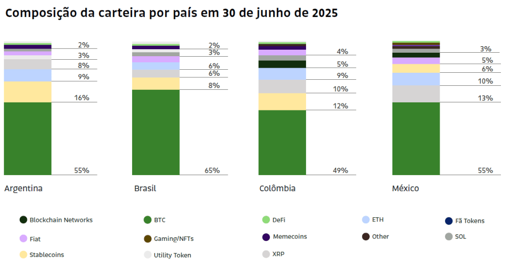 No México e na Argentina, o BTC ficou com 55% das composições das carteiras, enquanto na Colômbia, foram 49% dos investidores. Em segundo lugar aparecem as stablecoins, que fazem parte de 16% das carteiras na Argentina, 12% na Colômbia e 8% no Brasil, com o México sendo a exceção, onde a segunda posição é da XRP, com 13%.