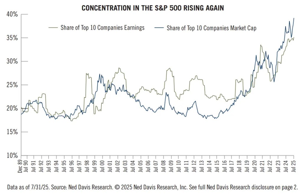 As dez maiores empresas do índice S&P 500 agora representam mais de um terço da avaliação total do índice — uma concentração que não era vista há meio século. Quando tanta riqueza está atrelada a tão poucas empresas, qualquer tropeço se torna um risco sistêmico.