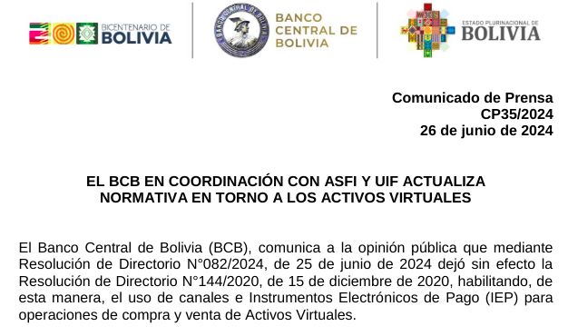“O Banco Central da Bolívia (BCB) comunica ao público que mediante Resolução N°082/2024, de 25 de junho de 2024, passa a ficar sem efeito a Resolução N°144/2020, de 15 de dezembro de 2020, habilitando, desta forma, o uso de canais e Instrumentos Eletrônicos de Pagamentos (IEP) para operações de compra e venda de Ativos Virtuais”, diz o comunicado.