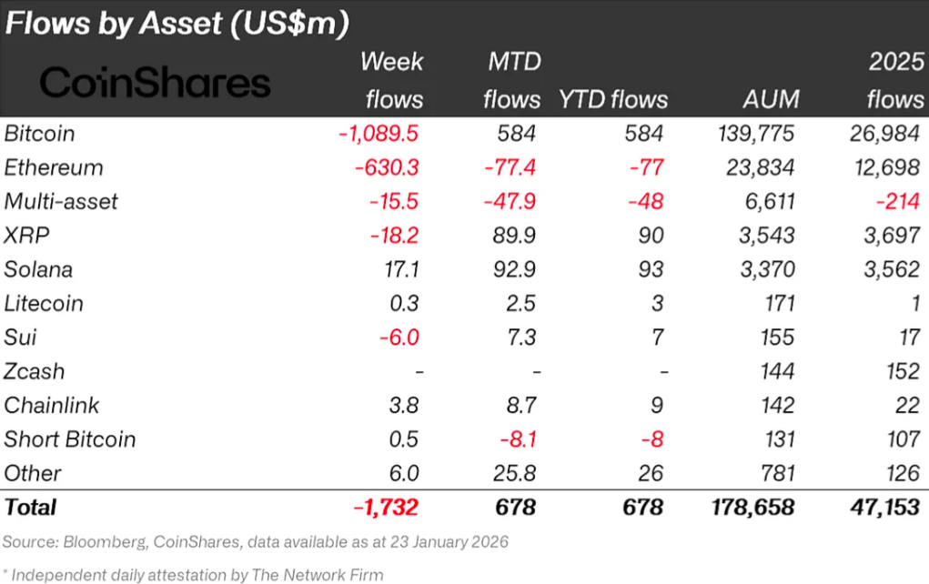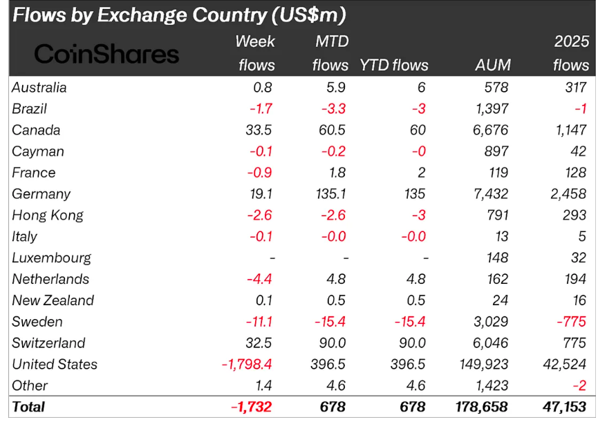 Os ETFs baseados em criptomoedas registraram saídas líquidas de US$ 1,73 bilhão na semana passada, a maior retração desde meados de novembro de 2025, de acordo com um novo relatório da CoinShares. A reversão, que eliminou a movimentação positiva de US$ 2,2 bilhões da semana anterior, teve maior concentração nos EUA.