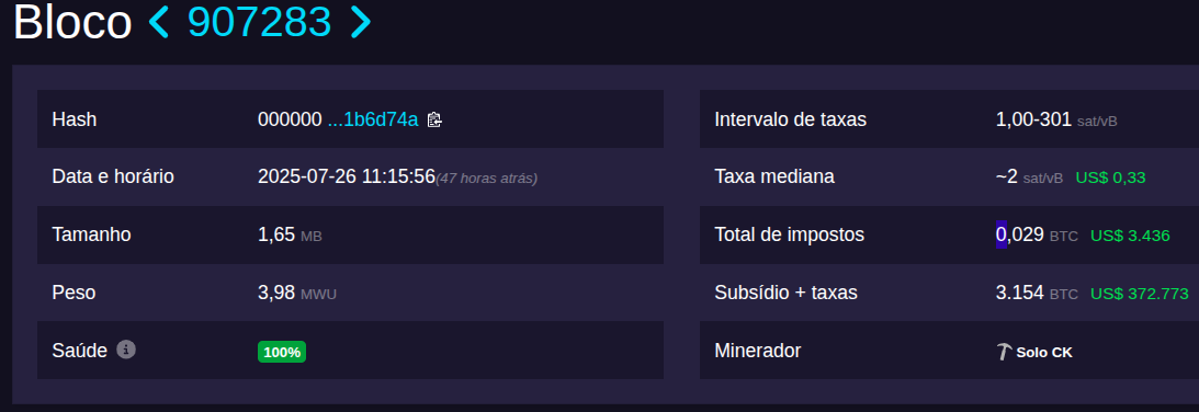 Um minerador solo com pouco poder de computação criou o bloco 907283 do Bitcoin no sábado (26) e recebeu 3,154 BTC como recompensa — o equivalente a cerca de R$ 2 milhões, considerando a cotação de US$ 118 mil do BTC na ocasião.