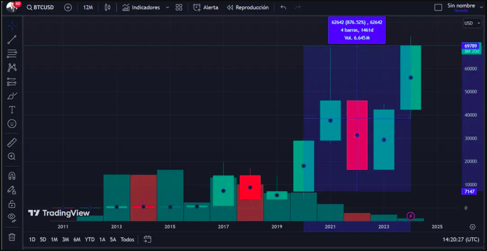 No entanto, os mineradores podem arcar com uma queda de 50% nas recompensas em BTC porque há uma valorização do preço que torna mais lucrativo minerar em termos de moeda fiduciária: entre janeiro de 2020 e abril de 2024, o preço do Bitcoin aumentou 943% em dólares americanos.