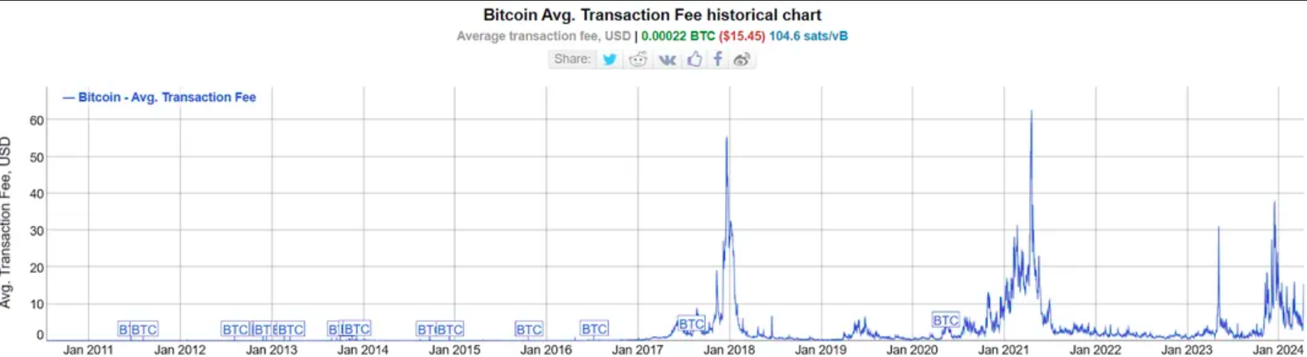 Hoje, a taxa média por transação é de 0,00001 BTC (3,4 sats/vByte), cerca de US$ 1,18 de acordo com o Bitinfocharts. Em dólares, isso significa até US$ 15 pelos preços atuais. Em 2017, a taxa média era de cerca de US$ 1, e em 2012, de cerca de US$ 0,01.