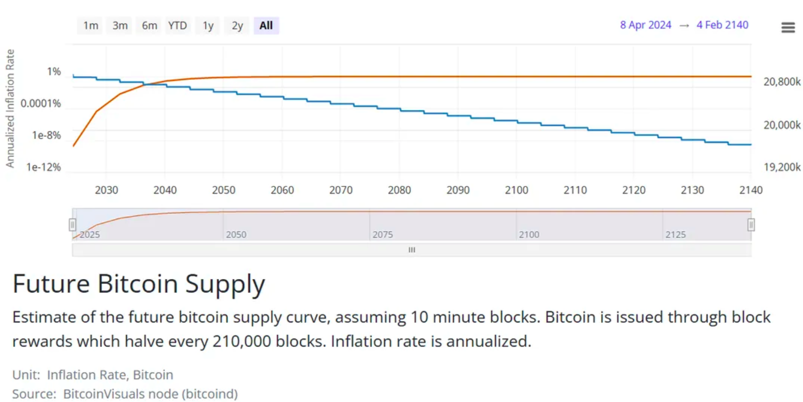 Avançando um pouco mais para 2140, o ano em que se espera que o último Bitcoin (ou, realisticamente, o último satoshi — a menor denominação de Bitcoin) seja minerado. Nessa época, a taxa de inflação do Bitcoin já teria se estabilizado.