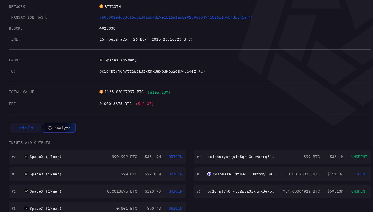 De acordo com as informações no blockchain, 399 BTC foram destinados ao endereço ‘bc1qh…galzy’, enquanto outros 764 BTC seguiram para ‘bc1q4…u54ez’. Conforme apurou o site The Block, essa é a movimentação mais relevante da SpaceX desde 29 de outubro, quando a empresa havia enviado 281 BTC para um novo endereço.