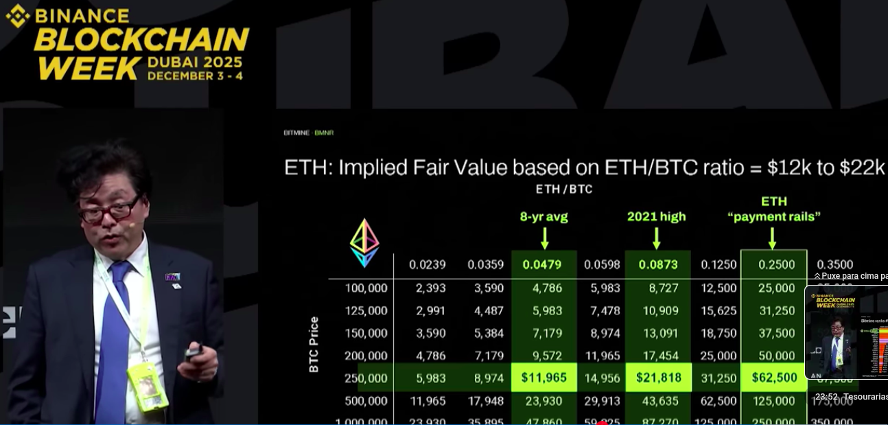 O analista de mercado Tom Lee fez uma nova previsão de preço para a segunda maior criptomoeda do mercado, Ethereum, durante sua participação na conferência cripto Binance Blockchain Week 2025 em Dubai. Segundo ele, a moeda pode chegar a valer US$ 62 mil se a relação de preço Bitcoin/ Ethereum passar por um ajuste diferente dos históricos.